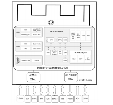 Fg3161hixx-02. | Hi3861v100, 802.11b / g / n, 1t1r, UArt / gpio / i2c / pwm / spi / sdio / i2s, pcb ant, 18 * 20 мм, pcb v3.0 (новый HDK) Рекомендуется использовать. |