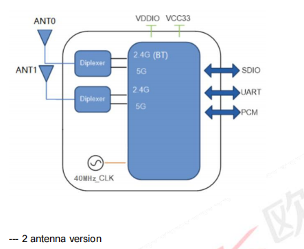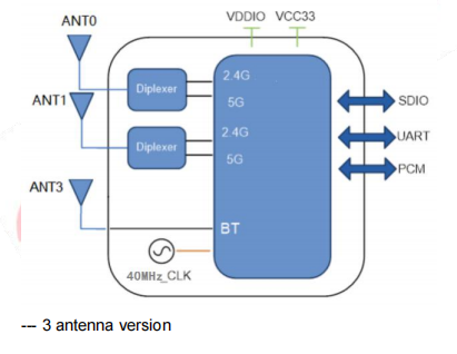 Поддерживает низкую мощность SDIO3.0 (соответствует интерфейсу SDIO 1.1 / 2.0) для интерфейса WLAN и UART / PCM для Bluetooth.